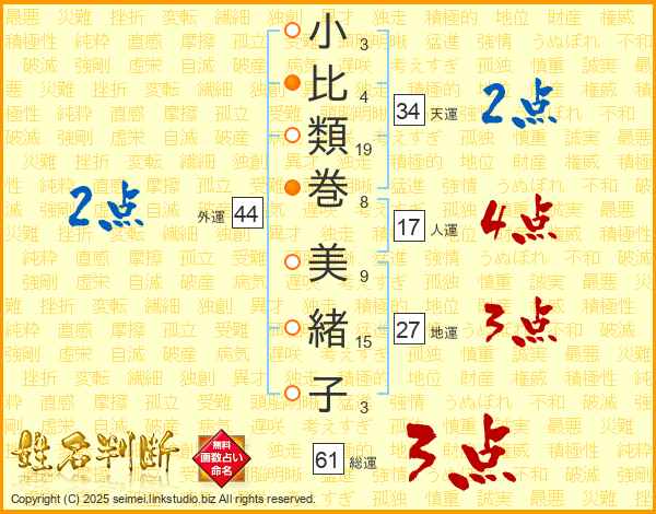小(3画)比(4画)類(19画)巻(8画) 美(9画)緒(15画)子(3画)