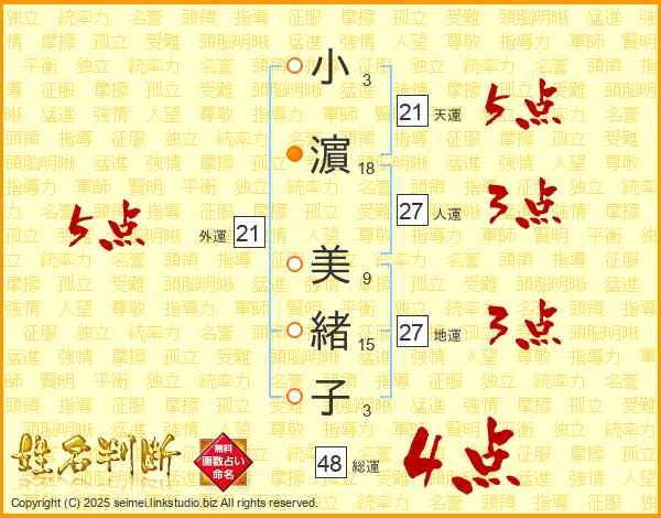 小(3画)濵(18画) 美(9画)緒(15画)子(3画)