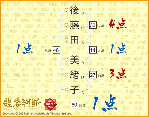 後(9画)藤(19画)田(5画) 美(9画)緒(15画)子(3画)