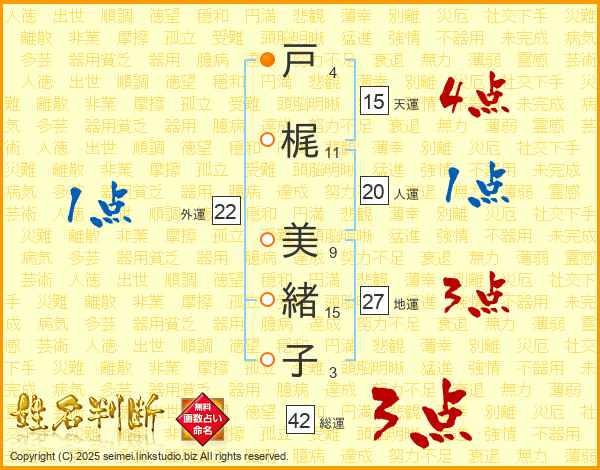 戸(4画)梶(11画) 美(9画)緒(15画)子(3画)