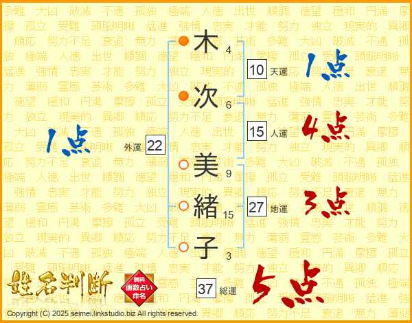 木(4画)次(6画) 美(9画)緒(15画)子(3画)