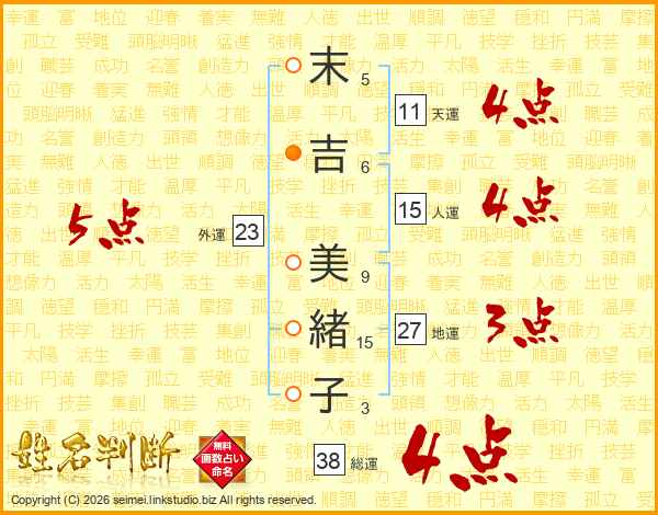 末(5画)吉(6画) 美(9画)緒(15画)子(3画)