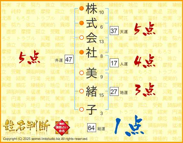株(10画)式(6画)会(13画)社(8画) 美(9画)緒(15画)子(3画)