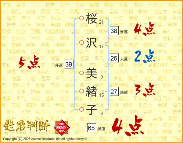 桜(21画)沢(17画) 美(9画)緒(15画)子(3画)