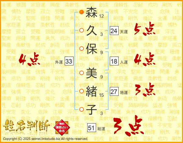 森(12画)久(3画)保(9画) 美(9画)緒(15画)子(3画)