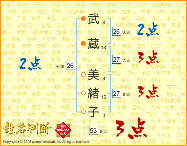 武蔵美緒子さんの総運は53画の3点!