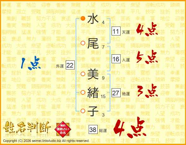 水(4画)尾(7画) 美(9画)緒(15画)子(3画)