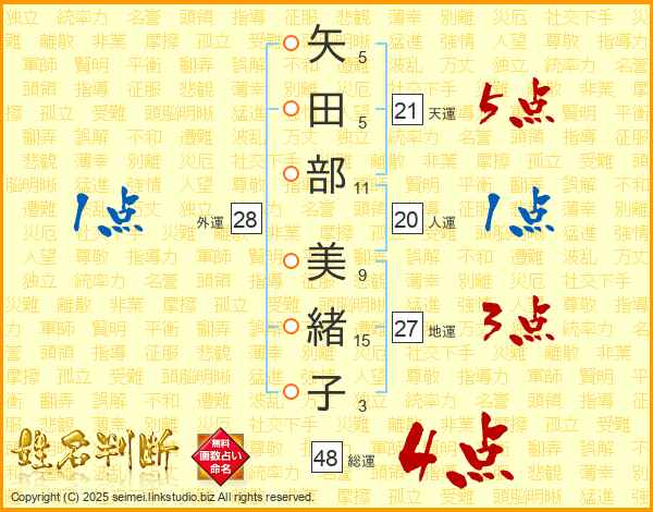 矢(5画)田(5画)部(11画) 美(9画)緒(15画)子(3画)