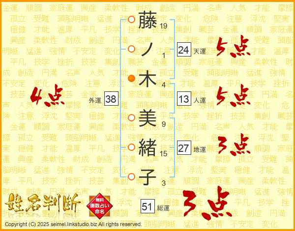 藤(19画)ノ(1画)木(4画) 美(9画)緒(15画)子(3画)