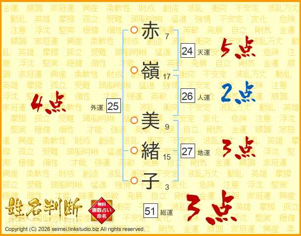 赤(7画)嶺(17画) 美(9画)緒(15画)子(3画)