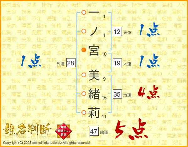 一(1画)ノ(1画)宮(10画) 美(9画)緒(15画)莉(11画)