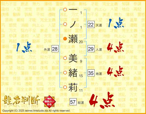 一ノ瀬美緒莉さんの総運は57画の4点!