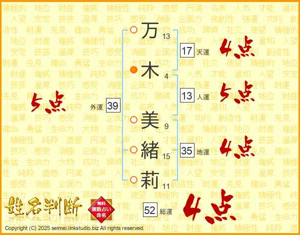 万(13画)木(4画) 美(9画)緒(15画)莉(11画)