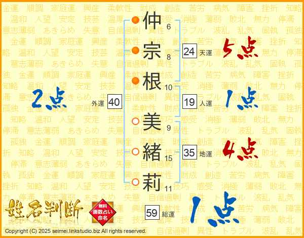 仲(6画)宗(8画)根(10画) 美(9画)緒(15画)莉(11画)