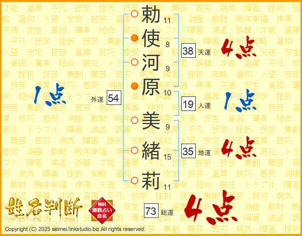 勅(11画)使(8画)河(9画)原(10画) 美(9画)緒(15画)莉(11画)
