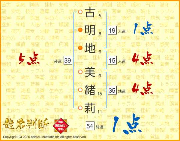 古(5画)明(8画)地(6画) 美(9画)緒(15画)莉(11画)