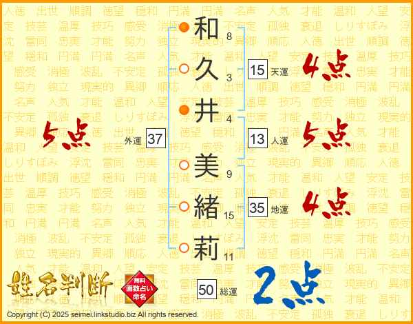 和(8画)久(3画)井(4画) 美(9画)緒(15画)莉(11画)