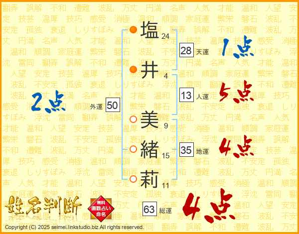 塩(24画)井(4画) 美(9画)緒(15画)莉(11画)