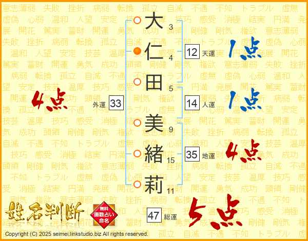 大(3画)仁(4画)田(5画) 美(9画)緒(15画)莉(11画)