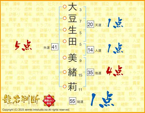 大(3画)豆(7画)生(5画)田(5画) 美(9画)緒(15画)莉(11画)