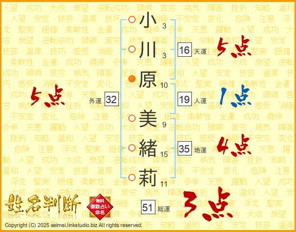 小(3画)川(3画)原(10画) 美(9画)緒(15画)莉(11画)