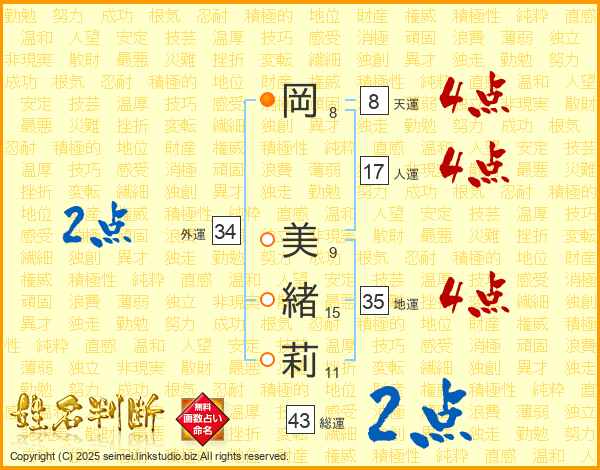 岡(8画) 美(9画)緒(15画)莉(11画)