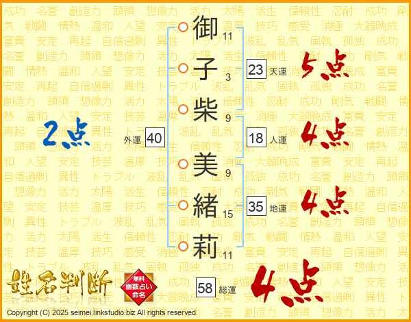御(11画)子(3画)柴(9画) 美(9画)緒(15画)莉(11画)