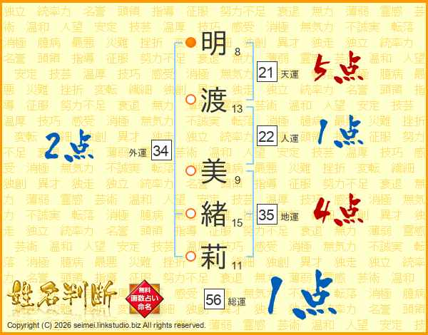 明(8画)渡(13画) 美(9画)緒(15画)莉(11画)