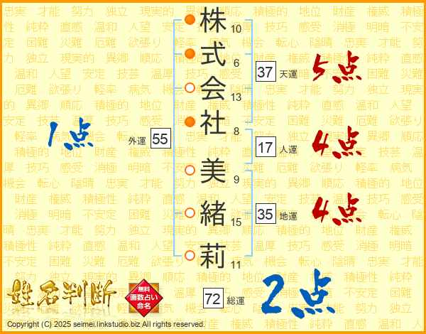 株式会社美緒莉さんの総運は72画の2点!