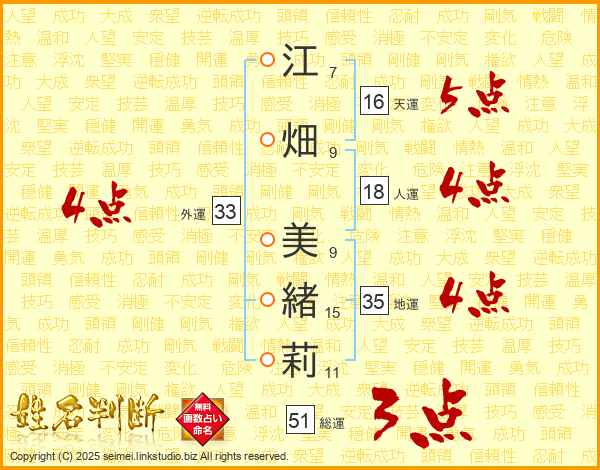江(7画)畑(9画) 美(9画)緒(15画)莉(11画)