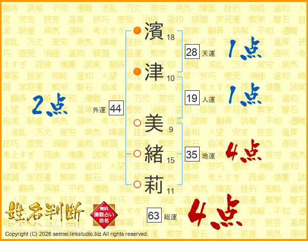 濱(18画)津(10画) 美(9画)緒(15画)莉(11画)