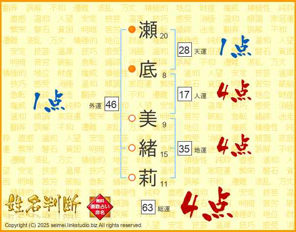 瀬(20画)底(8画) 美(9画)緒(15画)莉(11画)