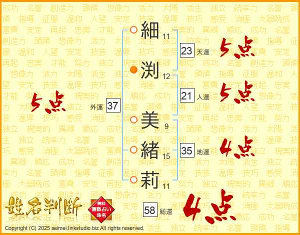 細(11画)渕(12画) 美(9画)緒(15画)莉(11画)
