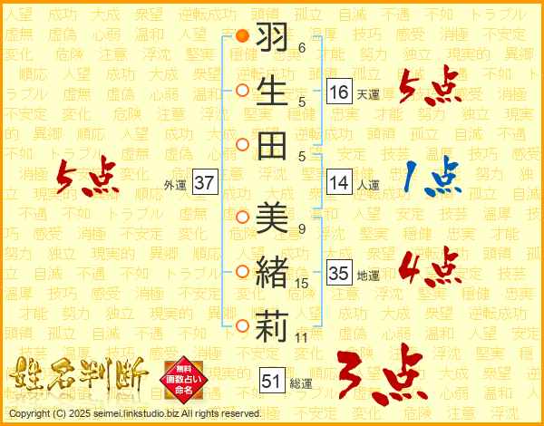 羽(6画)生(5画)田(5画) 美(9画)緒(15画)莉(11画)