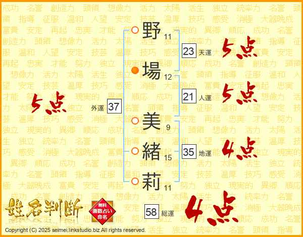 野(11画)場(12画) 美(9画)緒(15画)莉(11画)