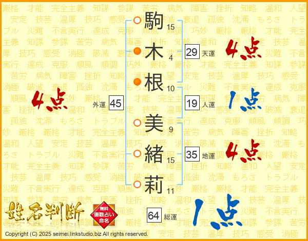 駒(15画)木(4画)根(10画) 美(9画)緒(15画)莉(11画)