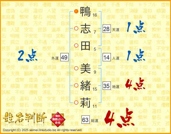 鴨(16画)志(7画)田(5画) 美(9画)緒(15画)莉(11画)