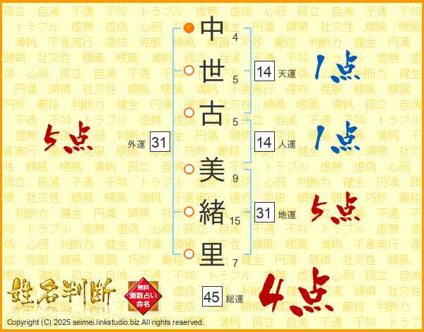 中(4画)世(5画)古(5画) 美(9画)緒(15画)里(7画)