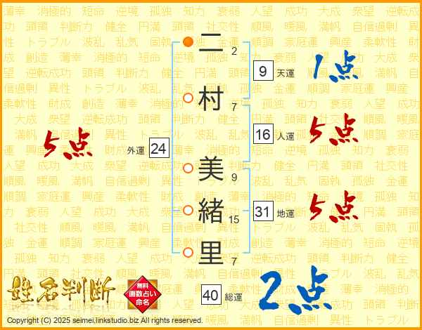 二(2画)村(7画) 美(9画)緒(15画)里(7画)