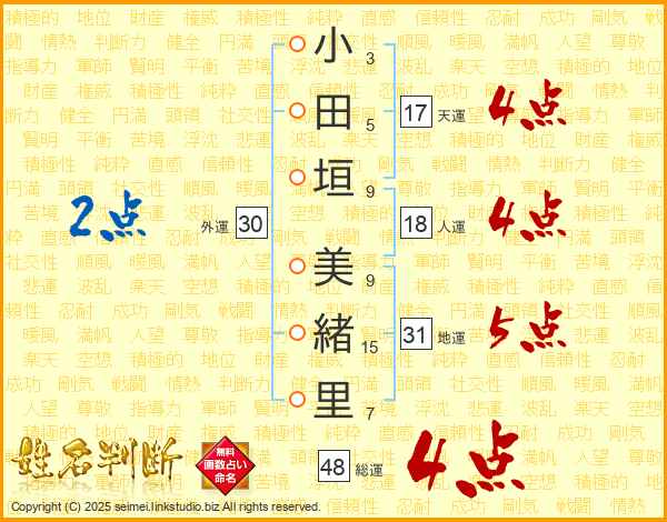 小(3画)田(5画)垣(9画) 美(9画)緒(15画)里(7画)