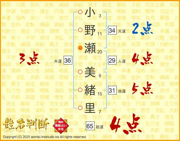 小(3画)野(11画)瀬(20画) 美(9画)緒(15画)里(7画)