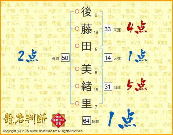 後(9画)藤(19画)田(5画) 美(9画)緒(15画)里(7画)