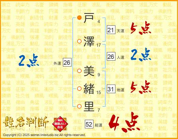 戸(4画)澤(17画) 美(9画)緒(15画)里(7画)