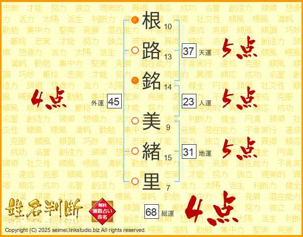根(10画)路(13画)銘(14画) 美(9画)緒(15画)里(7画)