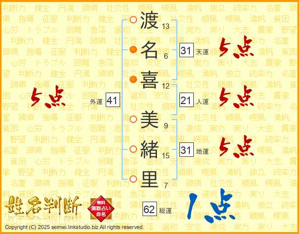 渡(13画)名(6画)喜(12画) 美(9画)緒(15画)里(7画)