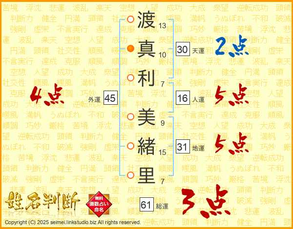 渡(13画)真(10画)利(7画) 美(9画)緒(15画)里(7画)