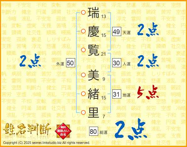 瑞(13画)慶(15画)覧(21画) 美(9画)緒(15画)里(7画)
