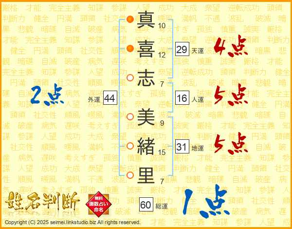 真(10画)喜(12画)志(7画) 美(9画)緒(15画)里(7画)
