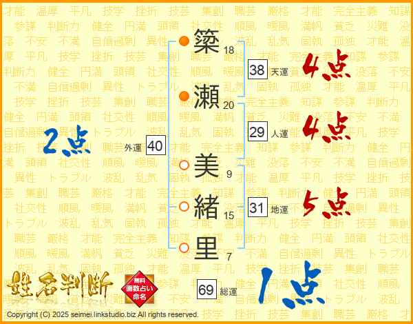 簗(18画)瀬(20画) 美(9画)緒(15画)里(7画)
