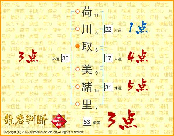荷(11画)川(3画)取(8画) 美(9画)緒(15画)里(7画)